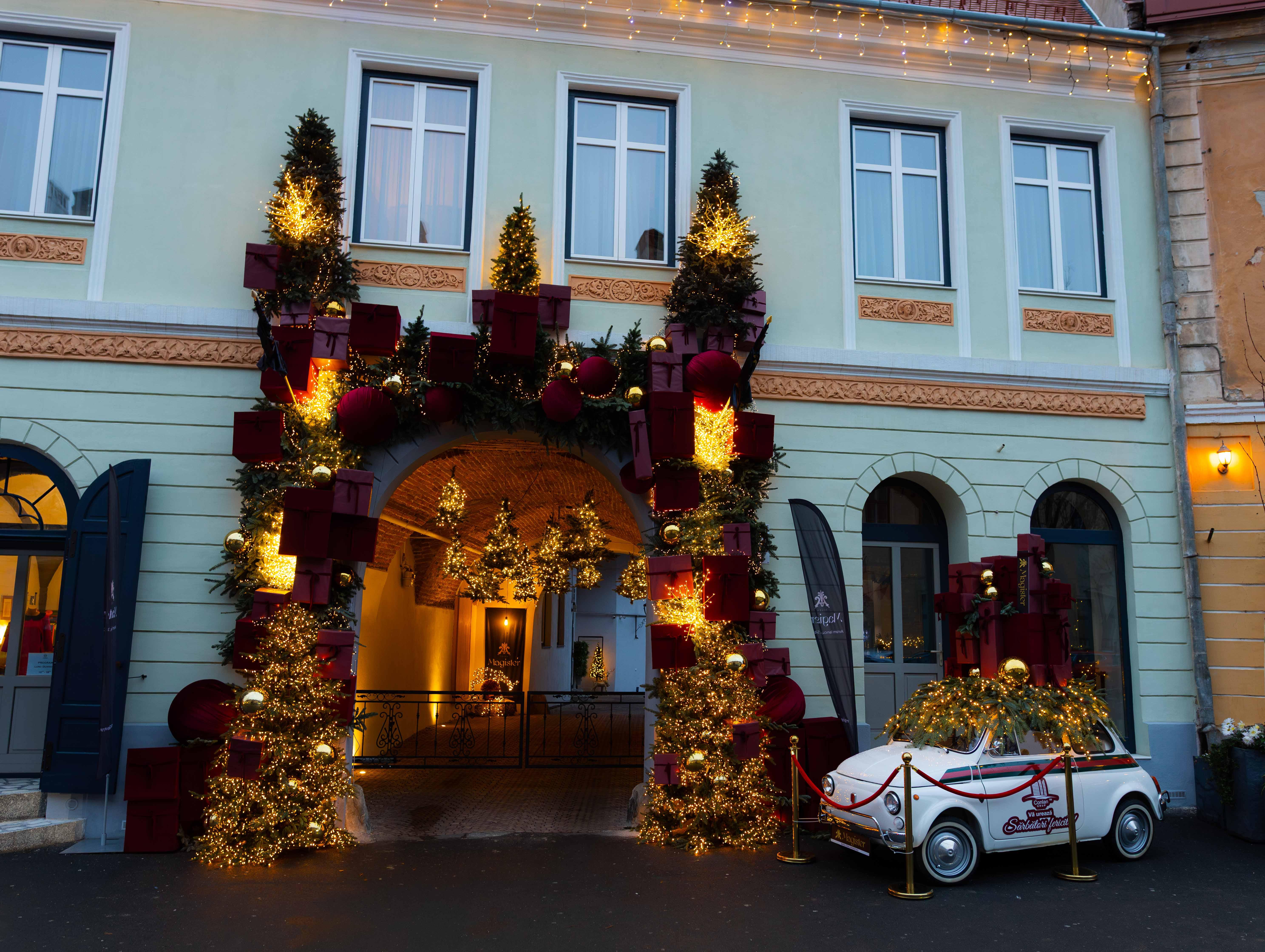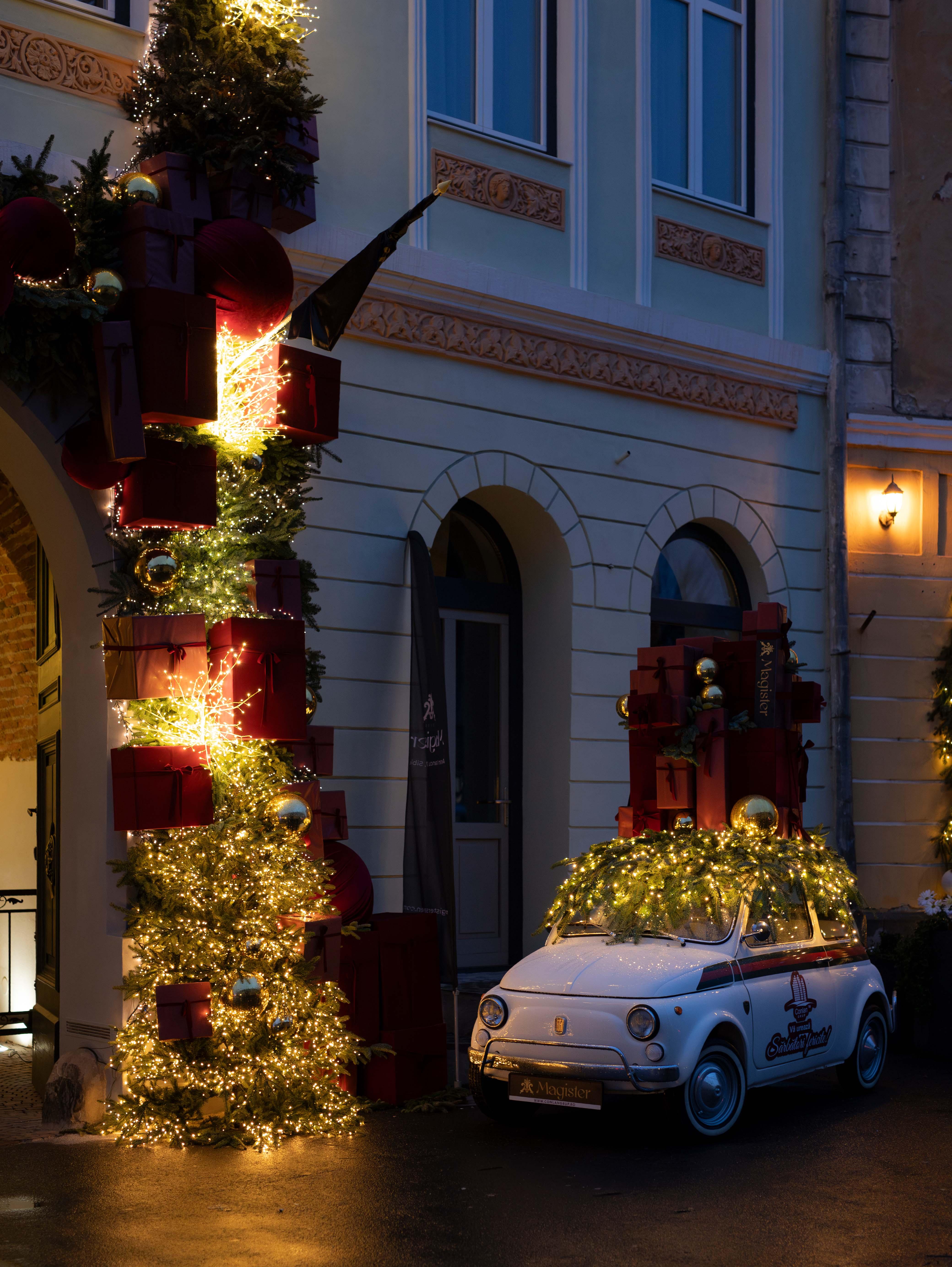 Când am început să amenajăm decorul pentru Magister Seven, ne-am dorit să creăm nu doar un colț festiv, ci o scenă care să amintească de începutul unui film de Crăciun. Ne-am imaginat trecătorii oprindu-se o clipă, ridicând privirea și simțind acel fior familiar al serilor din Ajun.